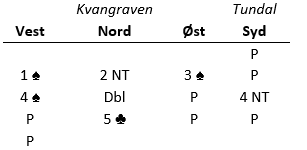 Kanskje burde vest doblet, men da han sa 5 hjerter var Ø/V i trøbbel. Tundal var vel litt grådig da han doblet 5 hjerter, og det ville blitt bedre for Ø/V om de hadde "rømt" til 5 spar. Det er dog ikke så lett å gjøre det når man ikke vet hva makker har!