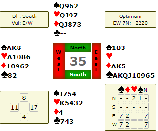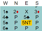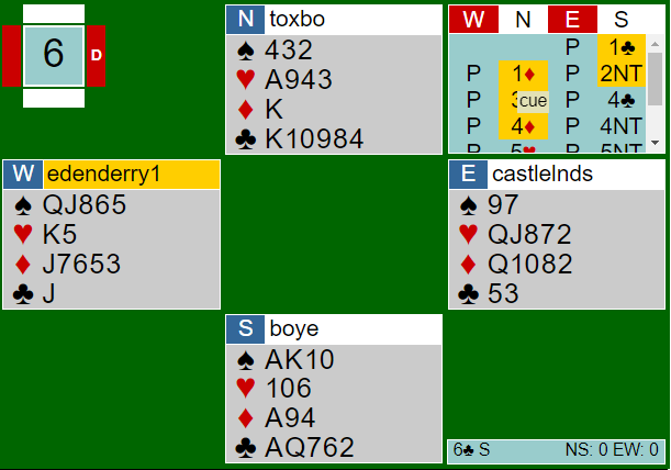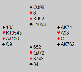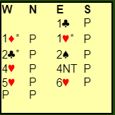 Meldingene er etter såkalt "kløverføringer" hvor 1 ruter viste hjerter (4+), og østs 1 hjerter trekorts hjerter. 2 kløver ba om 2 ruter (enten for å spille der eller invitere til utgang), men øst brøt "kravet" om å si 2 ruter med meldingen 2 spar fordi hun var så sterk. Da vest kunne melde utgang og har da den typiske invitthånden (til utgang) med femkorts hjerter tok øst kommandoen og tok dem til 6 hjerter via Key-Card 4NT hvor svaret viste at de ikke manglet noe nøkkelkort bortsett fra trumfdamen.