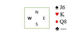 Det er ingen tapere utenom kløveren. Med denne fargekombinasjonen er det en safevariant for å unngå et valg hvis en finesse tas først. Ryker den blir det et valg andre gangen om man skal toppe ut den andre honnøren eller ta en finesse til. For å unngå det valget kan esset spilles først. Deretter må det spilles kløver mot Q-10-9-x og alt er i orden om syd har minst to kløver. Og hvis nord har singel knekt eller konge, eller K-J dobbel unngås på den måten valget i andre kløverrunde.