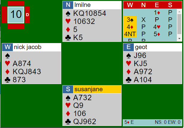 Makker Nick Jacob og jeg skal spille for Auckland/Northland sitt lag i åpen klasse.Tidligere denne uken prøvde vi oss på en treningsøkt uten at det gikk så bra. Her er et spill jeg følte det kunne (burde?) gått bedre: