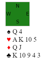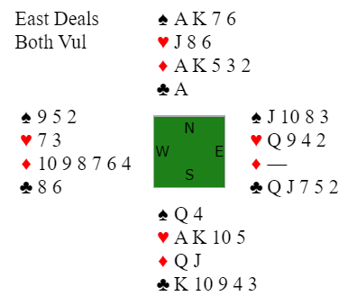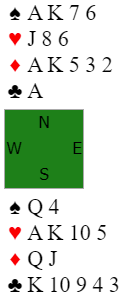 Nords siste melding er ganske vill. Hun vet at de mangler 4, 5 eller 6 poeng og 7NT kan være helt håpløst. Men siden syd hadde de perfekte ruterkortene Q-J var 7NT ganske bra. Det er tre sikre sparstikk, to hjerterstikk, to kløverstikk og normalt fem ruterstikk = 12. Det trettende kan komme via flere mulige skviser, og hjerter 10 gjør at det er en mulig hjerterfinesse også.