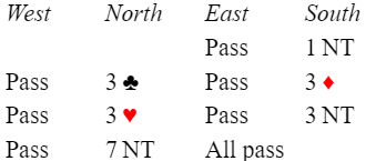 3 kløver var Puppet Stayman (for å sjekke om fire- eller femkorts majorfarge). Syd fortalte med 3 ruter om en eller begge major, fire kort. Nords 3 hjerter viste fire spar, og syd sa med 3NT at spar har jeg ikke (følgelig har syd vist fire hjerter). Nå hoppet nord til 7NT, og syds pulsrate hoppet sikkert også en del hakk.