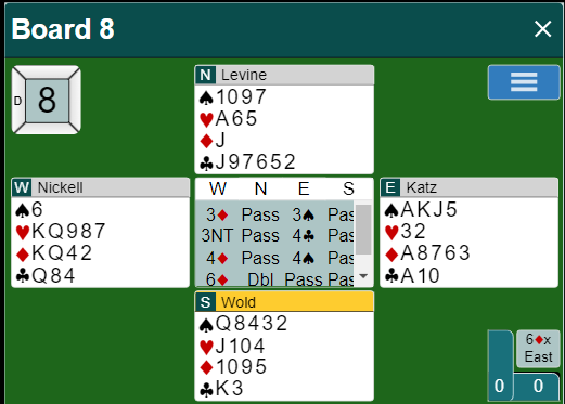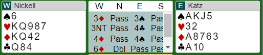 Da Ø/V hadde meldt seg opp i 6 ruter doblet Levine (nord). Det hadde startet med 1 hjerter - 2 ruter, og doblingen var Lightnerdobling, dvs. bordets først meldte farge skal spilles ut. Syd spilte ut hjerter knekt til kongen og esset. Tilbake kom en kløver, og Katz stakk med esset. Han var nok litt lettet over at det ikke kom hjerter tilbake til stjeling. Nå handlet det om å finne hjerteren, om det da ikke trumfen sitter 4-0 slik at det ikke er noen mulighet til å vinne kontrakten. Trumfen satt 3-1 med singelton hos nord. Hvordan tror du hjerteren sitter? (Husk knekten og esset har gått)