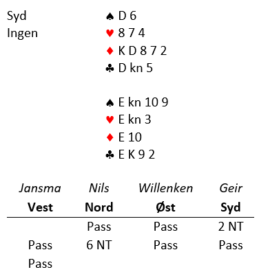 Så kom kløver konge i diagramsituasjonen. Vest som hadde ruterlengden hadde kun en hjerterhonnør og var ikke skviset. Toppspilleren Jansma så selvsagt at han måtte blanke hjerter konge for å holde ruteren idet det siste kløverstikket ble tatt fra syd. Siden ruterfargen ikke gikk ble det ett stikk for lite og en bet.