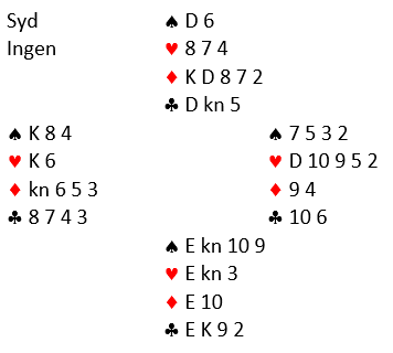 Det handler altså om å gjette ruteren. Så langt vet spillefører at nord har kun to kløver, syd har fem. Sånn informasjon øker sannsynligheten litt for å finne et bestemt kort – her ruter dame - hos den med fleste "ledige plasser". Det er nord.