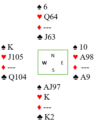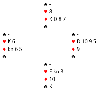 Problemet for spilleføer var nå at han hadde kun en trumf igjen hos blindemann. Så han måtte treffe hjerteren.