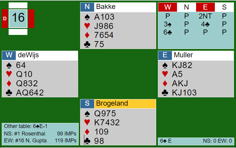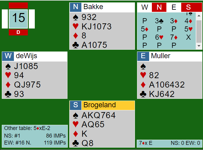 Skummelt spill, for om en ser kun på N/S sine kort er dette en glimrende slem som det norske paret fant. Men slemmen går bet pga. 4-0 sitsen i spar. Både 6 spar og 6 hjerter er glimrende, helt til en oppdager sparsitsen. Å være i slike slemmer som er gode, men går bet pga. sitsen er alltid surt - og skummelt, for det er ingen garanti de er i slem ved det andre bordet. Og som du ser nederst på bildet spilte Boye og Chrstian sine lagkamerater 5 ruter doblet somØ/V med to bet. -300. Hvis Boye og Chrstian hadde fått spille slem og gått bet ville det blitt 9 IMP ut og 42 IMP under før de siste femten spillene. Men for en gang skyld valgte Bauke Muller helt feil da han stampet i 7 ruter.