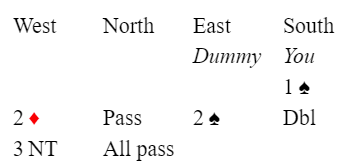 Spillefører prøvde sitt beste ved å spille liten spar, men da kunne vest ta for spar knekt og spar ess. Dermed kunne det ikke trumfes mer enn to kløver hos syd, og det endte med en bet.