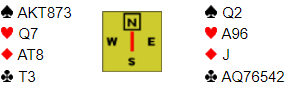 Øst kom i 6 kløver. Idet blindemann kommer ned etter ruter 2 (norske) i utspill fra syd ser det ut som de har havnet i en bra kontrakt. Å spille 6 spar kunne vært bra det og, men hvilken slem som er best avhenger av hvilken sort farge som eventuelt sitter skjevt. Hvis det er kun en kløvertaper ser det nokså greit ut, og det kan være ingen kløvertapere og hvis det sitter 2-2 med kongen i saks!
