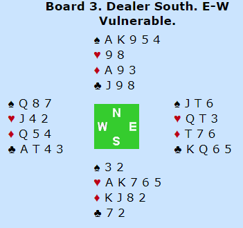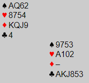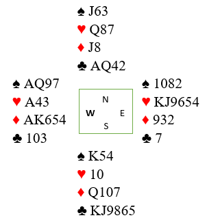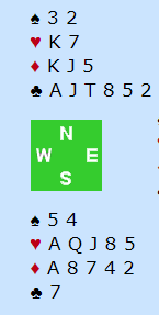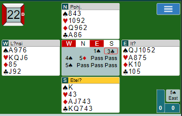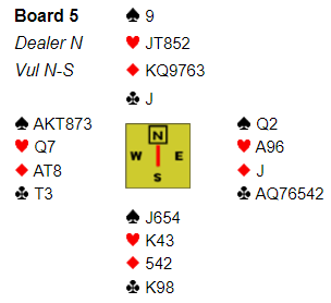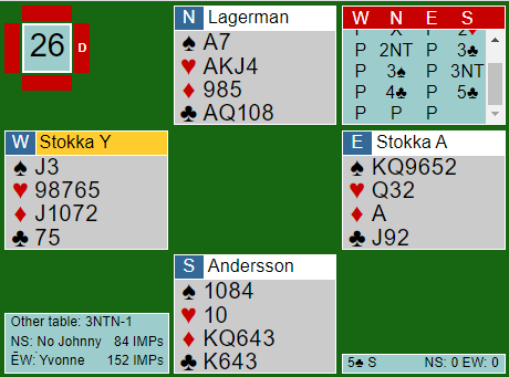 Dette diagrammet og meldingsforløpet er fra det andre bordet hvor du ser N/S havnet i 5 kløver spilt av syd. Vest spilte ut spar knekt. Spilefører stakk og spilte ruter, esset fra øst. Så kom to store spar og det måtte trumfes hos nord i tredje sparrunde. Det så ganske bra ut nå, men det var fortsatt bare ti sikre stikk siden ruteren satt 4-1. For å vinne må spillefører stjele en hjerter og få godspilt knekten, så tre runder trumf og ende hos nord fulgt av hjerter knekt og to ruterstikk. Men i stedet tok spillefører to runder trumf og gikk på ruteren. Det kunne fungert om ruter hadde vært fordelt 3-2, eller om den som har singel ruter hadde hatt kun to trumf. Men slik det satt ble det en bet.