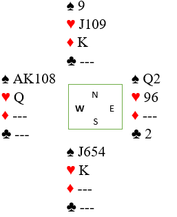 Du satser på at makker finner motspillet og ikke nødvendigvis har knekten i hjerter, og spiller derfor hjerter ess. Makker legger styrke, og du fortsetter med hjerter. Men hvilken hjerter?