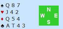Vel, det står jo 6 hjerter om sparfargen gir fire stikk så en minortaper kan kastes. Det nytter ikke å satse på ruter, for så snart N/S kommer inn tar det selvsagt ett stikk i kløver. Så spar må sitte veldig snilt, syd må ha både knekten og kongen.