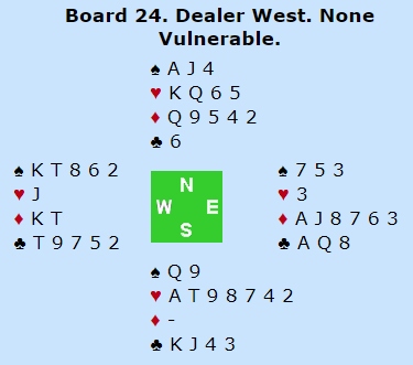 Men husk at spilleføreren ikke så Ø/V sine kort. Så i første stikk lasjerte han spar konge. Øst kunne puste lettet ut og fortsette med spar til nords nå single ess. Om spillefører går på ruteren direkte etter den starten blir det to bet i 3NT (taper fem sparstikk og ruter ess). Han spilte imidlertid fire runder kløver først, og da måtte øst kaste en spar for å holde damen tredje i hjerter og ruter ess. Så kom ruter fra nord, og det ble "kun" en bet.  Ø/V +100 og uavgjort spill.