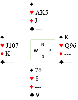 Hvis nord har KJx(x) i hjerter kan du skifte til hjerter 2. Da kommer hjerter tilbake idet nord vinner med hjerter konge, og vi får tre hjerterstikk. Men om nord ikke har hjerter knekt er det viktig å få tatt to hjerterstikk og få fatt i ruterstjelingen.