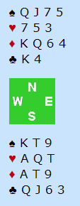 Ps. I meldingene handlet det mye om å unngå 3NT. Det kan se ut som det er hipp som happ om det spilles spar- eller hjerterkontrakt. Men merk at det tilfeldigvis er 4 spar som er best her fordi i den kontrakten kan ikke forsvaret presse spilleførers trumflengde. Et eventuelt kløverangrep kan i sparkontrakt stoppes med syds trumf (spar).