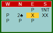 Nei, ikke slik jeg ser det i alle fall. Om dette er nok må nord ta ut med de kortene han her hadde. Det vanligste er altså at redoblingen normalt viser en bra femkorts farge. Da kan svarhånden passe og spille 2 kløver redoblet om han har brukbare kort og litt i kløver. Det har han her, og jeg synes pass er opplagt med 11 poeng og kongen dobbel i kløver. 2 kløver må gå bra tenkte nok nord og passet, men syd hadde det han burde hatt. Nord fikk selv den tvilsomme gleden av å spille den redoblede kontrakten.