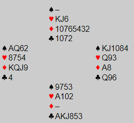 Med først en dyp sparfinesse som holdt (!), og deretter ikke flere dype sparfinesser fordi nord avslørte seg ved å be om undo ble 6 hjerter vunnet.