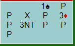Nords 3 kløver var fjerde farge krav (viser ikke kløver), og syds 3 hjerter betyr ikke nødvendigvis sekskorts farge. Uten kløverstopper kan han ikke si 3NT, så over fjerde farge på tre-trinnet må man ha ha en "nødmelding" hvis man ikke har ekstra lengde i en av fargene, og heller ikke sparstøtte.