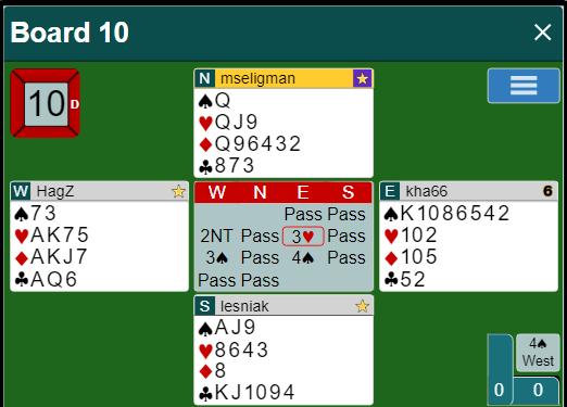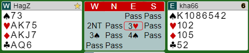 Etter to passer åpnet syd med 1 kløver, og nord sa 1 ruter som viste minst fire hjerter (kløverføringer). Nå slengte øst innpå 2 ruter. Syd sa 2 hjerter, men han har nesten til 3 hjerter med den fine fordelingen. Det er på grensen, så å si 2 hjerter er ikke feil.