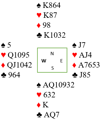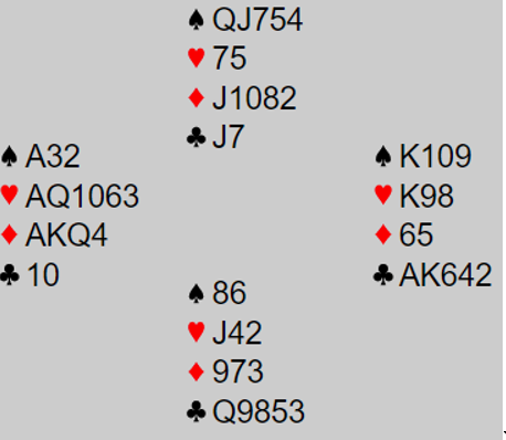 Da lykkes finessen med tieren, og på den fjerde kløveren kastes en hjerter. Du prøver senere hjerter til kongen for overstikket, men siden øst har esset blir også da ti stikk med to hjertertapere i tillegg til ruterstikket du tapte i starten.