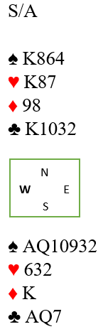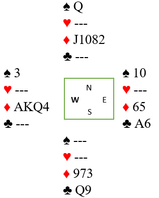 Toppstikk tas og overganger mellom hendene må passes på, men det er jo alltid overgang til vest i ruter idet skviskortet eventuelt tas fra øst. Sluttposisjonen kan for eksempel bli slik, etter også å ha tatt for begge sparhonnørene: