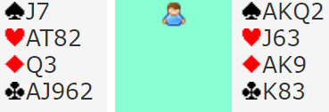 Her er det en enkel skvis som skal til, mot nord i spar og ruter. La oss si hjerter kommer i utspill (utspillet spiller ingen rolle).