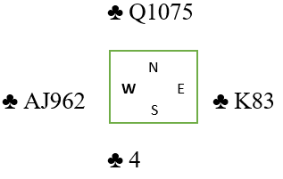 Det kan være ganske hipp som happ om det bør spilles fra topp med slik farge, eller om det bør tas A-Q og så liten til finesse med K-10. Tre store kløver gir fire stikk om knekten faller. Å spille ess-dame og så liten kløver til tieren lykkes om vest har knekten fjerde fra start.