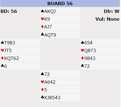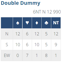 Det mulige ene ekstra overstikket slo ut mer i 3NT. De som fikk tolv stikk (+490) fikk -56. Å ikke finne slemmen, men få med seg maks med stikk (+520) ga +20.