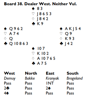 Brogeland spilte ut spar 10. Kranyak stakk med blindemanns dame og spilte en liten kløver. Hvis Bakke hadde hoppet på med kongen som er nesten umulig idet han ser ned på det bordet (vest), kløver eller hjertefortsettelse ville gitt bet. Men det gikk kløver 3, kløver 9, kløver knekt og…syveren!