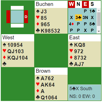 Det var noen få Ø/V-par som stampet i 5 kløver. De trodde nok de ville få et dårlig spill med -500 mot utgang utenfor sonen. Men så ble de reddet av alle Ø/V-parene som satt i mot 510 for 4 spar med tretten! Å sitte Ø/V med -500 i bet mot utgang som i teorien skal kunne gi kun 420 til N/S ga hele +93 av 127 oppnåelige poeng!
