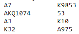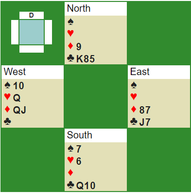 //Siden ruter ikke sitter verre enn 4-2 er det tolv toppstikk. Muligheten for det trettende er i hjerter. Underveis oppdages at nord har fire spar (og syd kun to), men syd har fire ruter (og nord kun to), så like langt i tellingen. Å telle opp slik er for å finne ut hvem som mest sannsynlig har kortfarge i hjerter, forhåpentligvis singel honnør. Men idet alle ruterstikkene tas vil syd sikkert kaste unna kløver og det kanskje nokså komfortabelt? Da øker sjansen for at han har lang kløver og er den som eventuelt har singel hjerter. Hvis spillefører klarer å legge ned hjerter ess kan det idet knekten kommer fra syd tas finesse over nord for overstikket. Å være i 6NT og notere akkurat hjemgang er greit nok, men det er de som får tak i alle tretten stikkene i 6NT som får kanonscore i dette tilfellet.//