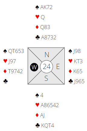 Ø/V har til sammen 31 HP, så det er ikke opplagt å melde slem. Hvis ikke syd finner på å sperremelde vil vest normalt få vite om 18-19 NT hos makkeren. Vest har imidlertid en hånd mer enn de 13 HP han teller opp, spesielt hvis han får vite om balansert fordeling hos øst, så vests to farger er veldig sannsynlig stikkgivende!