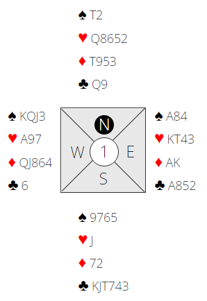 I 3NT, den mest vanlige kontrakten med slike kort bør det bli minst ti stikk. Ondag varierte det med fra +400 for ni stikk som ga -37 til N/S (maks var 60) til +460 for elleve stikk, og det ga +36. Innimellom der var det en del 4 hjerterkontrakter. Der ser det ut til å være to hjertertapere. Men om øst får komme inn kan vest få en kløvrestjeling, og øst får fortsatt ett stikk i trumf. I så fall blir det kun ti stikk. De som fikk ti stikk i 4 hjerter måtte tåle -22, mens de som fikk tak i det ellevte stikket fikk +22. Ett N/S-par fikk tolv stikk i hjerterkontrakt, og det må ha skjedd ved at øst glemte å dekke hjerter dame så det ble kun en hjertertaper. Akkurat den motspillsfeilen må antagelig også ha skjedd der N/S fikk gigantiske +990 for 6NT med tolv stikk. Det ga nest topp. Det er vanskelig å se for seg at det blir tolv stikk i grand uten at man slipper unna med en hjertertaper med damen som får seile idet øst ikke dekker, så sette opp hjerteren senere med esset og en til. Da er det stikk i bøtter og spann.