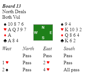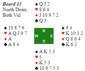 Det er 4+2+5+1 = 12 sikre stikk. Det trettende kommer om man legger ned riktig honnør i hjerter og feller singel knekt eller dame, så tar finesse. Så det gjelder å finne ut hvem som kan ha singelton hjerter, om noen av dem har det da. Her er hva som ble nevnt om akkurat det i forhåndskommentaren: