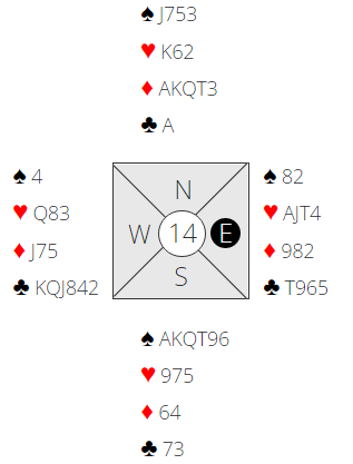 I dette spillet ble det uhyre enkelt for nord. Over svaret 3 kløver støttet han til 4 kløver, og trumfen var fastsatt. Syd meldte 4 ruter som kontrollmelding (første- eller andre rundes kontroll), og nord gikk på med 4 spar som med kløver, ruter eller hjerter som trumf kan brukes som Key-Card Blackwood. Det er for å holde svarene så lavt som mulig i de tilfellene det også må spørres om trumfdamen. I dette tilfellet ville det blitt akkuarat det samme om nords spørsmål om antall nøkkelkort hadde vært 4NT. Syd viser uansett to nøkkelkort (hjerter ess og trumfkongen, kløver konge). Da visste faktisk nord absolutt ALT og kunne melde sluttkontrakten og egentlig forlange de nødvendige stikkene allerede før blindemann ble lagt ned!