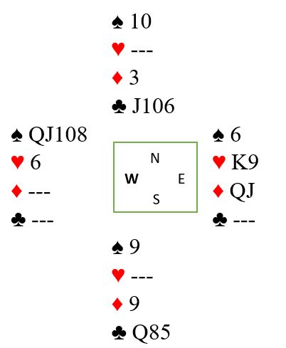 Det er vest som må spilles inn, for det er han som kan bli uten frikort og må gi favør. Øst har jo ruterstikket. Vest har dessverre for han kun dobbelton ruter! Så du tar for A-K i ruter. Da er vest er strippet for alt annet enn majorkort. Og øst som nå sitter og ser på ruterstikket sitt har ikke større spar enn tieren. Sluttposisjonen har blitt slik: