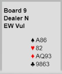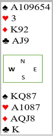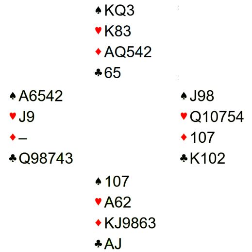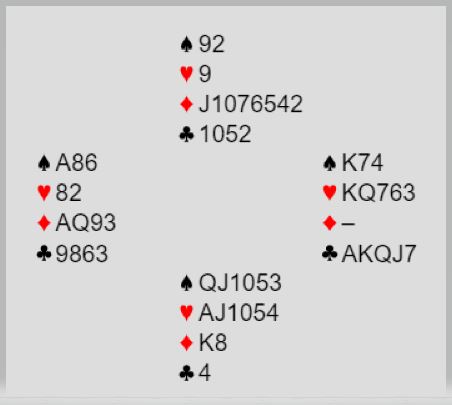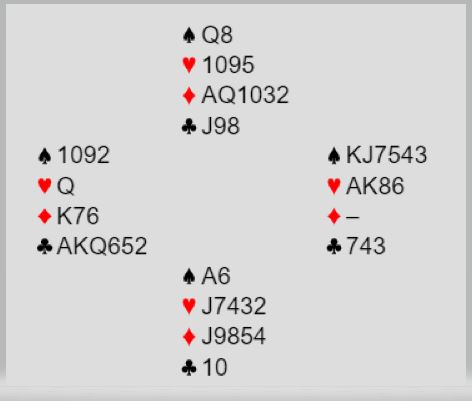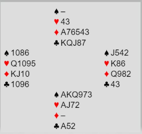 6 kløver er en bra slem som ble meldt ved begge bord. Slik det sitter går det ikke an å få færre stikk en tolv, selv om det kommer ruterutspill. Med ruter ut vil det dog bli litt press på spillefører som ikke vet hvordan det sitter. To rutere kan kastes på hjerterstikkene og det bør gjøres før en tar kløverfinessen i tilfelle den ryker. Kontrakten avhenger i så fall etter den starten av å unngå kløver eller spartaper. Om trumfen gir en taper gjenstår å tippe sparen. I dette tilfellet kommer jo kløver konge på med det samme, og det handler om sparvalget for overstikket.