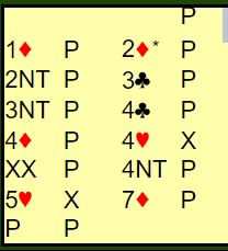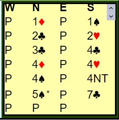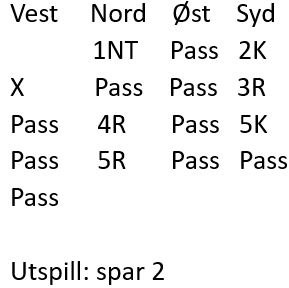 Gunn Helness var mer optimistisk å meldte 2 ruter cue-raise. Det ga Fredrik Helness sjansen til å ta vest med på råd, og han sa 2 spar - naturlig invitt. Da meldte Gunn 4 hjerter pga. den fine spartilpasningen til østs sidefarge.