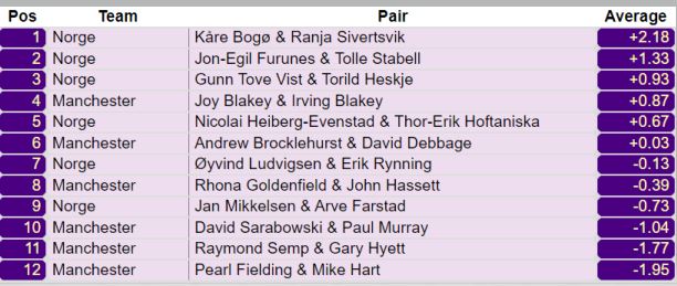 Om de fikk tak i det viktige overstikket i 5 kløver ble det pene +65 på spillet. De som fikk kun elleve stikk og +400 fikk likevel middels fordi det var ganske mange som gikk bet i slem.