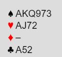 La oss si det kommer spar ut mot 6 kløver, eller 5 kløver. Om du spiller 5 kløver er det som så ofte påpekt viktig å få med seg overstikket, spesielt siden det er parturnering. Det eventuelle ekstrastikket gir mange ekstra matchpoints i et stort parturneringsfelt!