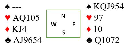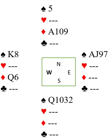 Lise spilte ut spar knekt. Ved det andre bordet hadde også øst støttet ruteren med omvendt minor, men der hadde øst vist singelton hjerter. Ved det bordet fulgte nord "hovedregelen" og spilte ut trumf. Slik så hele spillet ut: