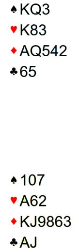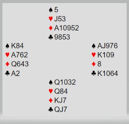 //Å tenke parturnering i dette spillet, og derfor gi seg i 3NT vil gi N/S et gladspill. Der er det elleve stikk fra topp.//