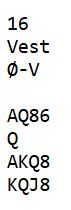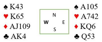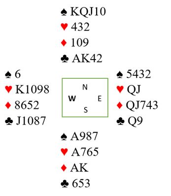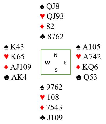 Det er ni toppstikk, 4+1+2+2 = 9. Hvor skal det tiende komme fra? Vel, hvis trumfen sitter 3-2 blir det en stjeling på en av hendene senere, og da blir det fem trumfstikk totalt. Men da spillet forekom startet mange med trumfen. I andre trumfrunde kastet vest ruter 6, så øst startet altså med fire trumf. Hvis trumfen tas ut nå er det en sjanse at kløveren sitter 3-3. Da kan ett ekstra stikk godspilles i den fargen. En kan tenke på å få seg ett ekstra i hjerter hvis den fargen sitter 3-3. Men etter en sånn start begynte det å blir litt klønete. Det går dog an å kontre tilbake til det man burde tenkt på i starten for å få det til fortsatt. For dette er et spill med en stjeleverdi! Det ser ikke ut som det er en stjeleverdi som er løsningen med 4-3 farger over alt, og i den fargen det er en dobbelton er det dobbelton på den andre siden også! Men joda, her kan man greit sikre seg et stjelestikk på den ene siden og beholde fire trumf på den andre, totalt fem trumfstikk.