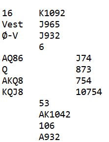 Seksten av de 156 Ø/V-parene meldte og vant 6NT som altså går bet med spar ut. Å notere +1440 ga (litt heldig) 93%.