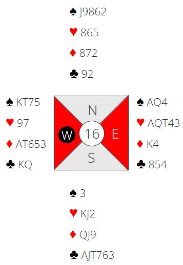 Mot 4 hjerter doblet ble utspillet en ruterhonnør, og slik så hele spillet ut: