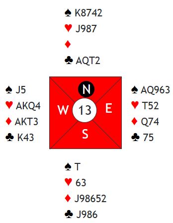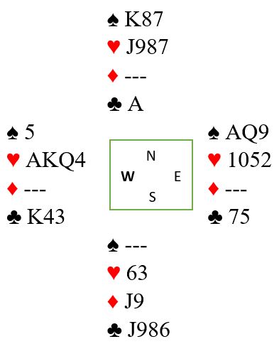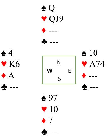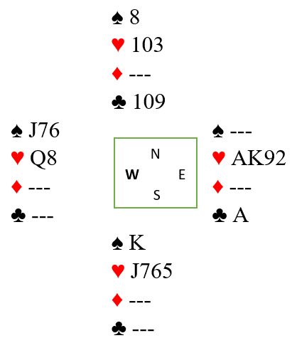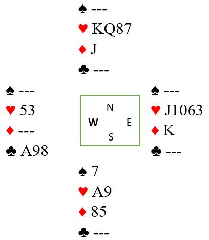 På spar 7 fra syd kastes ruter dame, og øst er ferdig. Kastes ruter konge tar syd for ruter 8 som nå er en vinner før de tre største hjerterne tar resten. Hvis øst kaster en hjerter blir det fire hjerterstikk til slutt.