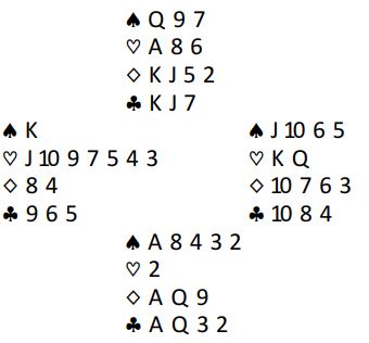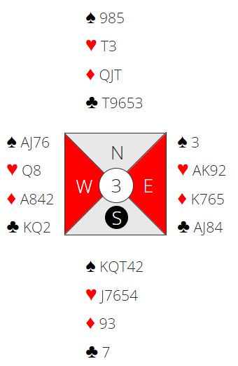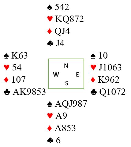 N/S havnet i 6 spar, og vest spilte ut hjerter knekt. Spillefører så med det samme at trumfen var litt i tynneste laget med ganske stor fare for to trumftapere. Slemmen avhenger normalt av at trumfen sitter 3-2 med spar konge hos vest. Man kan med slik farge spille på kongen dobbel hos øst med esset og liten fra begge hender. Men at vest har kongen tredje er en bedre sjanse (flere kombinasjoner) enn kongen dobbel hos øst.