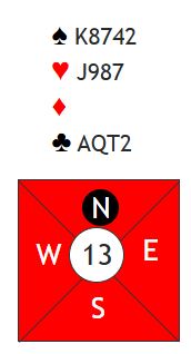 Først telles de sikre stikkene, og det er 2+2+4+3=11. Det tolvte kan komme ved at hjerteren sitter 3-3. Det er også en liten sjanse for at sparfargen kan gi tre stikk (for eksempel Q-J dobbel). Hovedsjansen er imidlertid at det blir tre hjerterstikk. Ett hjerterstikk må gis bort. Hvis det spilles A-K i hjerter og nok en hjerter går det bra om fargen faktisk sitter 3-3. Men om hjerteren sitter 4-2 kan motstanderen med fire hjertere ta beten med det samme. Så i dette spillet bør det dukkes en hjerter, dvs. liten hjerter fra begge hender.