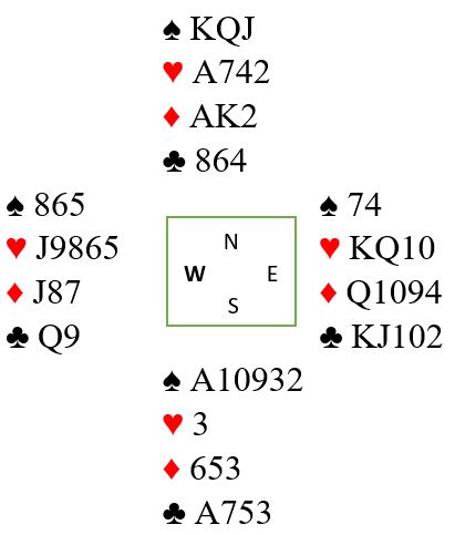 Da spillet forekom så den nokså uefarne spilleføreren at det kunne gå bra om hjerteren satt 3-3. Så i full fart fulgte to ganger trumf for å ta bort vest sine trumfer, så tre ganger hjerter i håp om 3-3 sits. Men da ble det kun 10 stikk siden det ble en rutertaper til slutt.