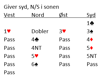 4 kløver og 4 ruter var kontrollmeldinger, og da syd viste ett Key Card over 4NT spurte nord om trumf dame med 5 hjerter. Syd viste med 5 grand at han har trumfdamen og kløver konge slik de spiller.